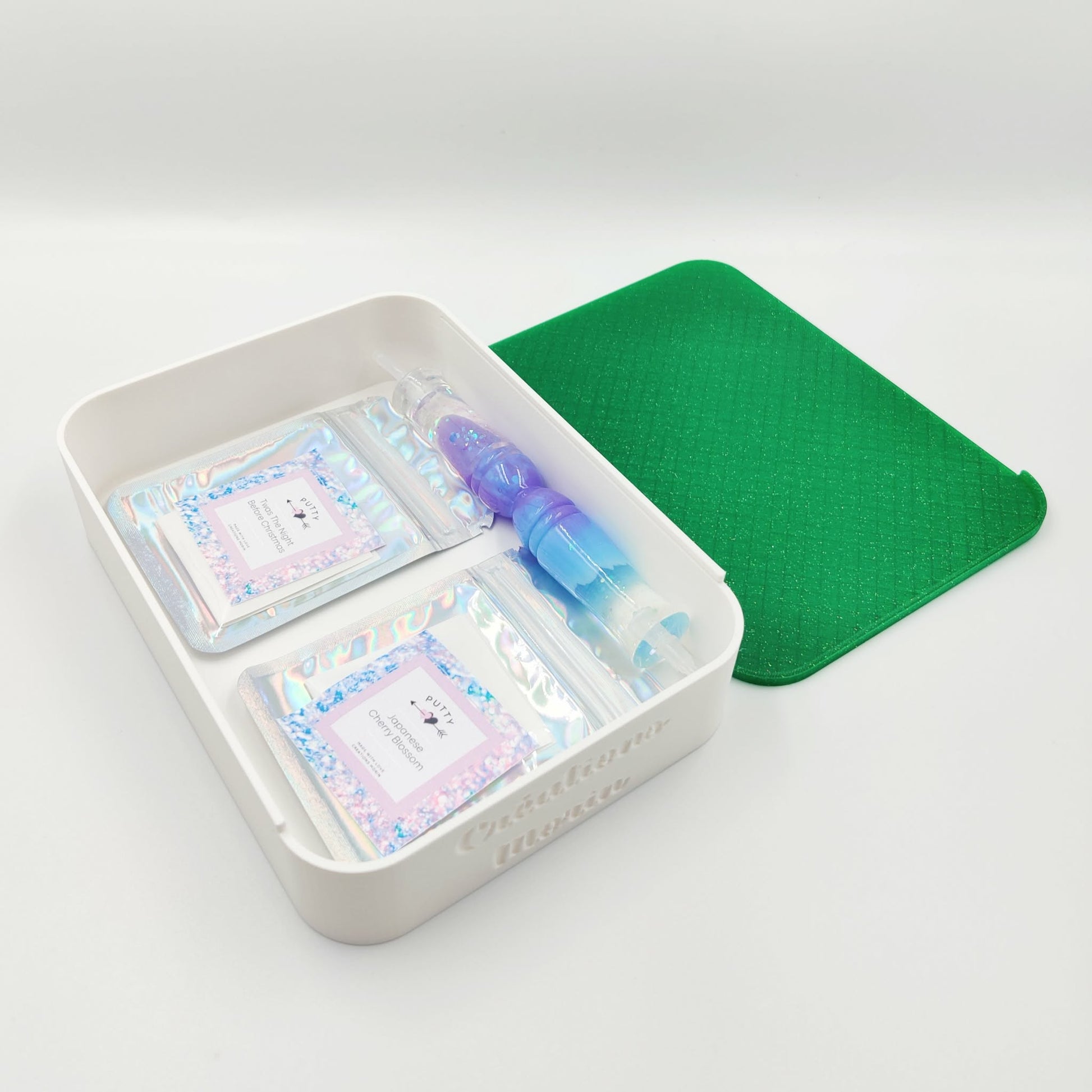 This our mega storage box! It is like a mega tray (without the lines). You can use it to store all your diamond painting items between your sessions or to travel. It fits 2 puttys pouches side by side (and a lot in thickness) and it's big enough to fit your pens as well!